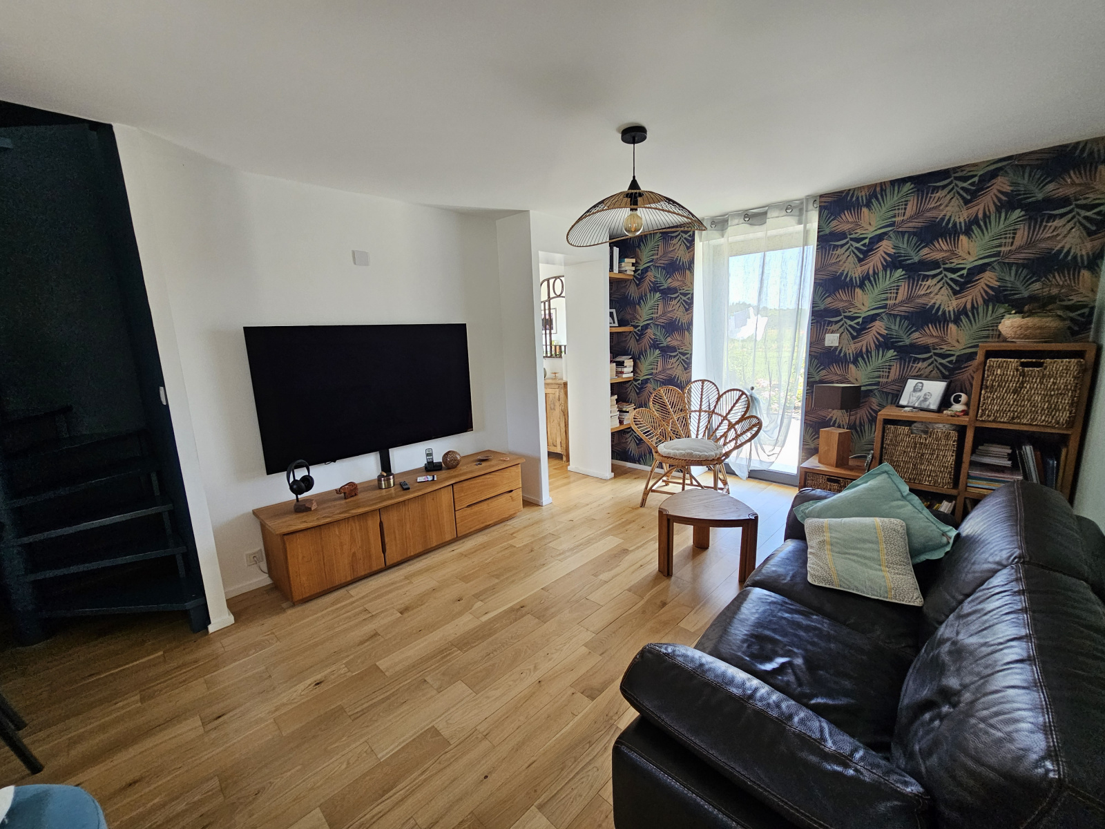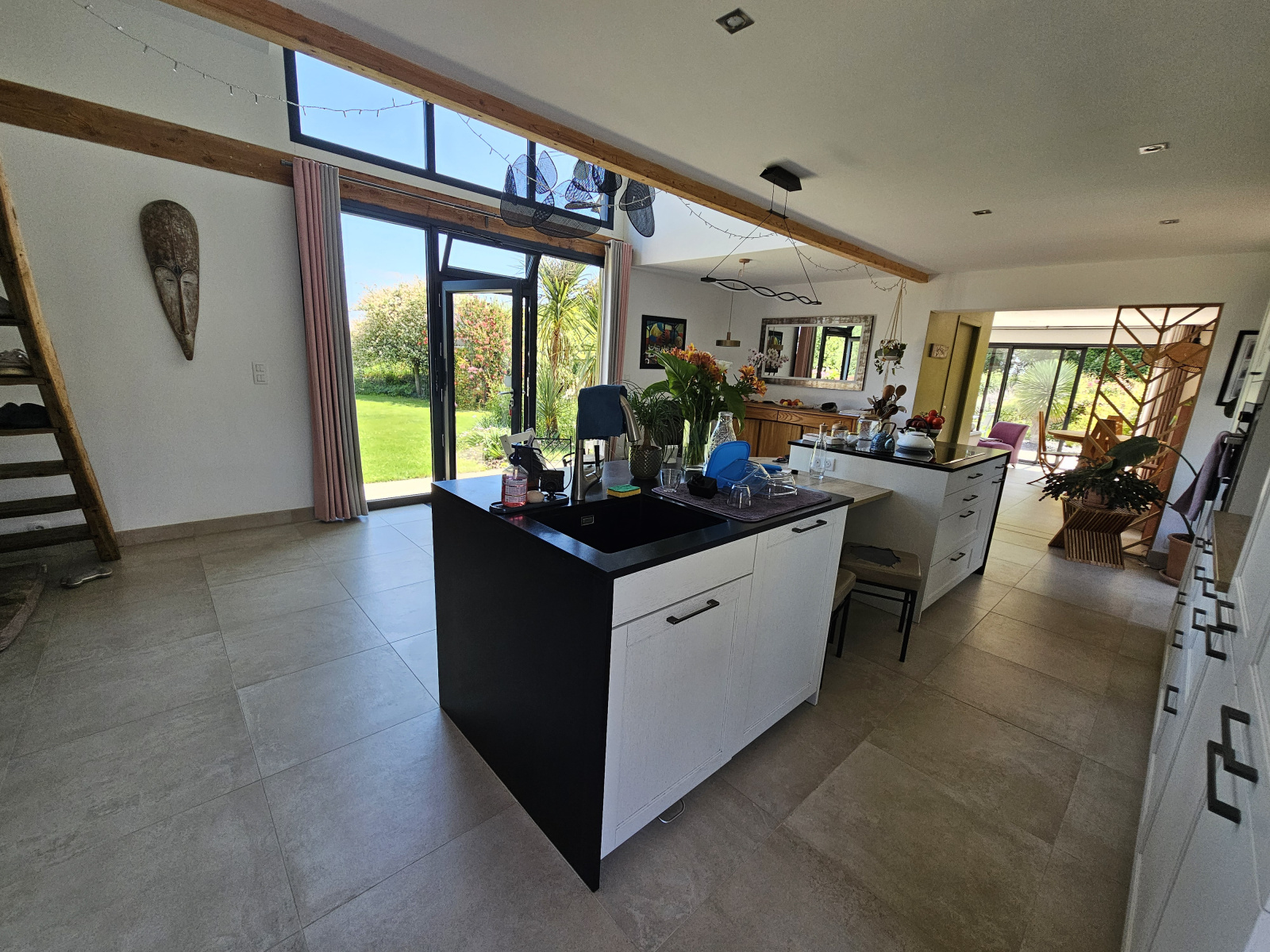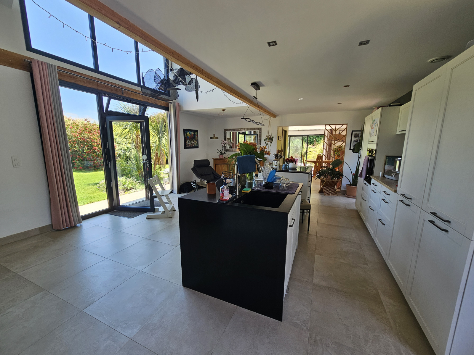 Vous entrez dans une pièce de vie de 60m², baignée de lumière par sa grande verrière et mettant en évidence une très belle cuisine équipée.