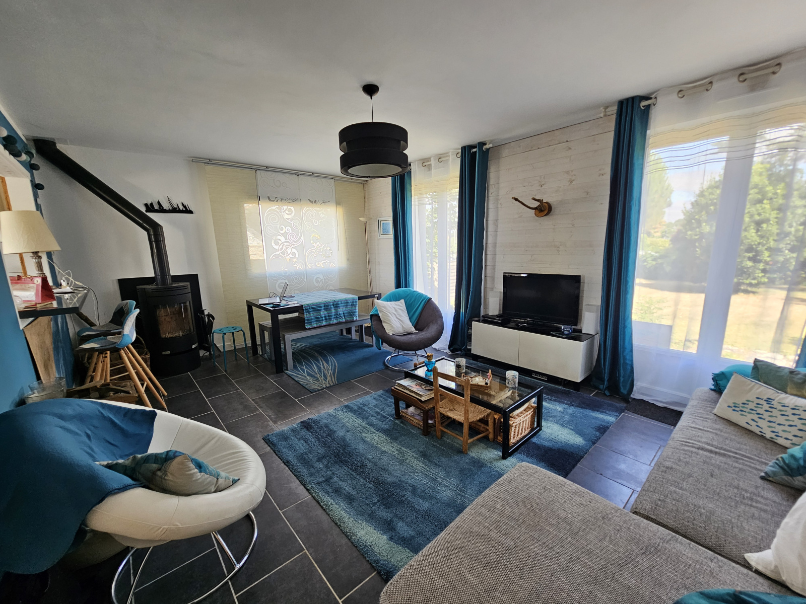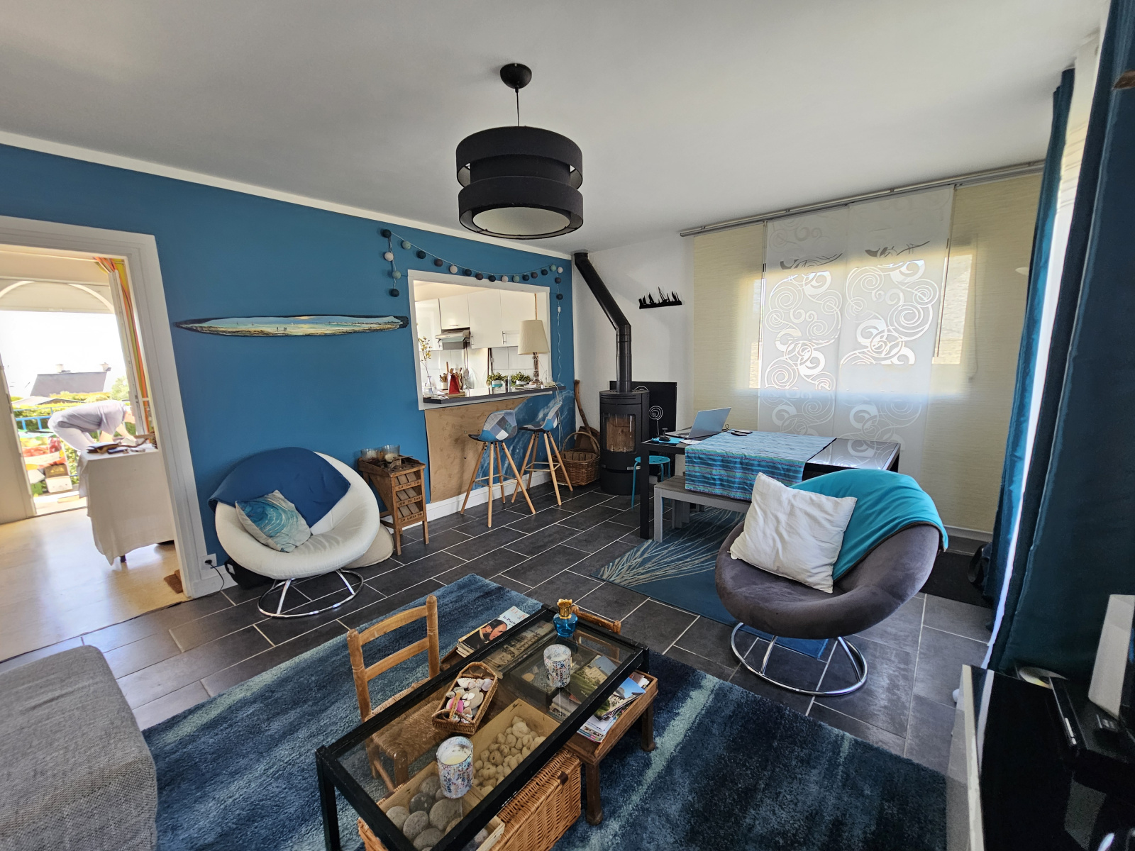 On y retrouve un hall d’entrée, une cuisine, un salon avec son poêle à bois et l’accès au jardin, une chambre, salle d’eau et WC.